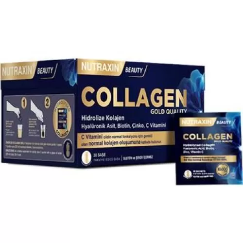 Nutraxin Hidrolize Collagen Toz;30 Saşe;Nutraxin Collagen, B’iota Laboratuvarları tarafından formüle edilmiş, güzelliği içerden destekleyen bir gıda takviyesidir.;NUTRAXIN Collagen, güzellik kavramında önem taşıyan hyalüronik asit, çinko, biotin, selenyum ve diğer mikro besinleri bir arada sunar. İçeriğinde yer alan kolajen, kolay emilim sağlayan hidrolize kolajendir. Ananas aroması ile içimi lezzetlidir.;“Biotin normal saç, normal mukoza ve normal cildin korunmasına katkıda bulunur.”;“C vitamini, cildin normal fonksiyonu için gerekli olan normal kolajen üretimine katkıda bulunur.”;“Çinko normal DNA sentezine katkıda bulunur.”;“Çinko normal cildin korunmasına katkıda bulunur.”;“Çinkonun hücre bölünmesinde görevi vardır.”;Ürün Detayları;Her 1 Saşede (11 G);Hidrolize Kolajen 10.000 mg;C vitamini (L-askorbik asit) 300 mg;Hyalüronik Asit 10 mg;Çinko 10 mg;Vitamin B5 6 mg;Vitamin B6 1,40 mg;Vitamin E 6 mg;Biotin 2500 mcg;Selenyum 55 mcg;Diğer İçerikler;Sitrik Asit, Aroma, Beta Karoten (E 160A), Sukraloz (E 955);Bilgi: Şeker, nişasta, tuz, maya, gluten, soya, mısır ve süt ürünleri gibi potansiyel alerjenleri içermez. Sentetik renklendirici ve koruyucu kullanılmamaktadır.;Kullanım Şekli;Yetişkinler için takviye edici gıda olarak günde 1 saşeyi (11 gr) 1 bardak suyla (250 ml) hazırlayıp tüketiniz. İyice karıştırınız.